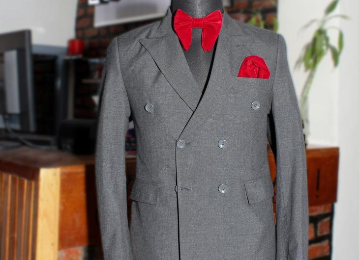 Gris, avec noeud papillon et mouchoir de poche rouges.