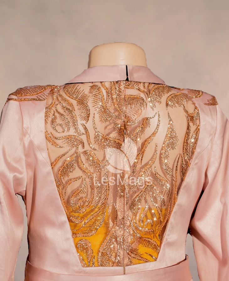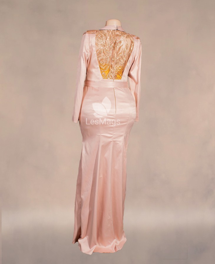 Robe soirée de couleur saumon à manches costume et col tailleur