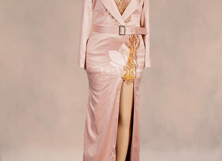 Robe soirée de couleur saumon à manches costume et col tailleur