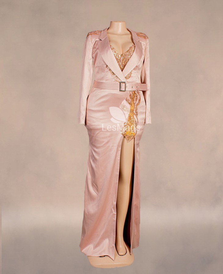 Robe soirée de couleur saumon à manches costume et col tailleur